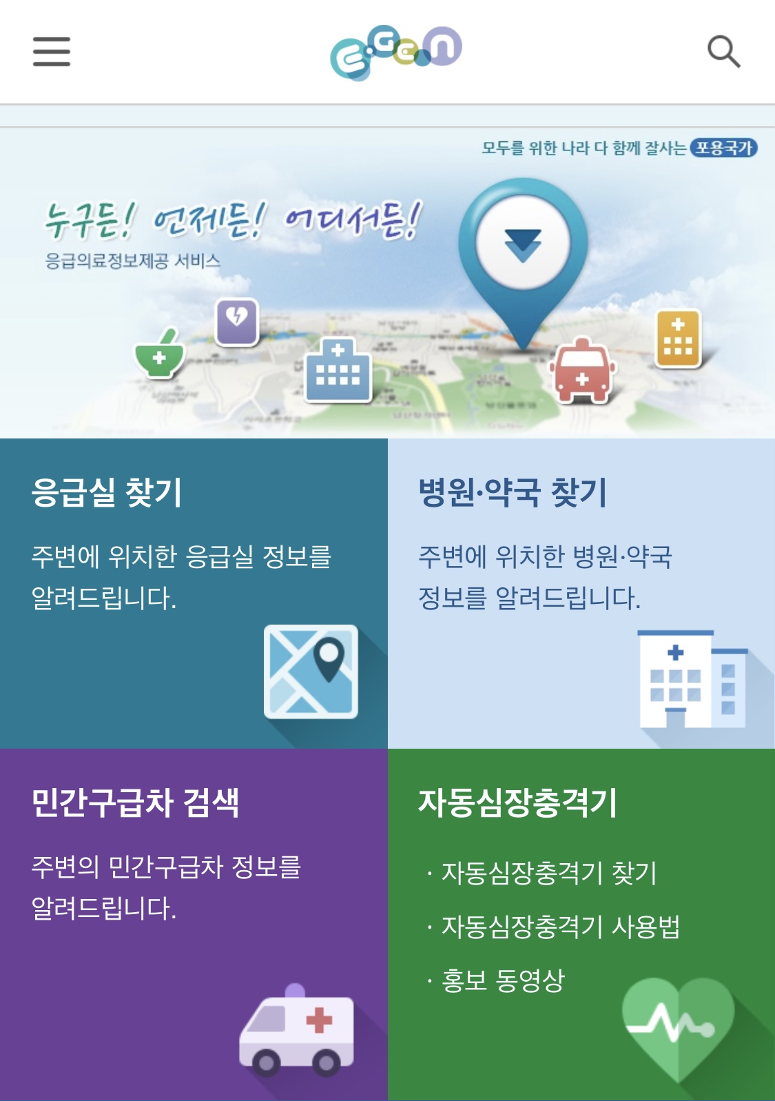 응급의료정보제공 앱은 사용자 위치 기반으로 주변에 문 여는 병·의원과 약국을 지도로 보여주고 진료시간 및 진료과목 조회도 가능합니다.